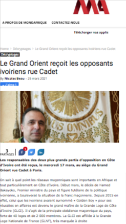 Un article du 25 mars 2021 fait état d’une rencontre entre le Grand Orient de France (GODF) et les opposants ivoiriens le 17 mars 2021 : une rencontre des francs maçons avec les mouvement des anciens présidents Bédié et Gbagbo.