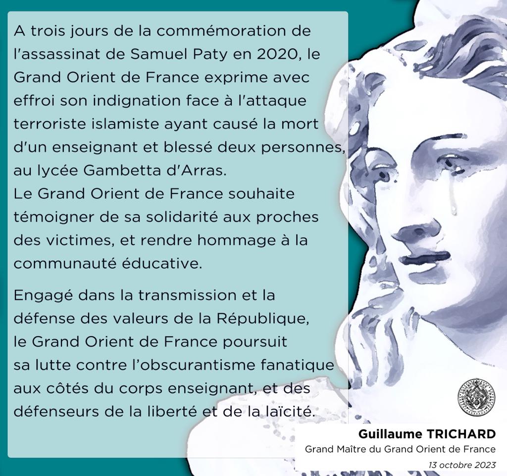 Guillaume TRICHARD, Grand Maître du Grand Orient de France (GODF) a publié sur son compte X (Ancien Twitter ) le communiqué suivant :