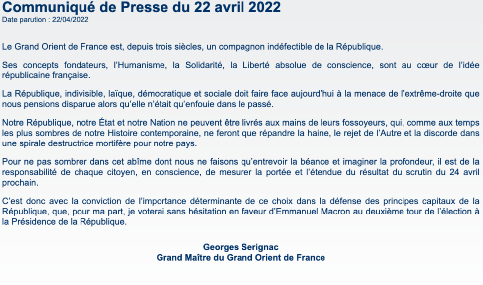 Communiqué du GRAND ORIENT DE FRANCE en date du 22 avril 2022