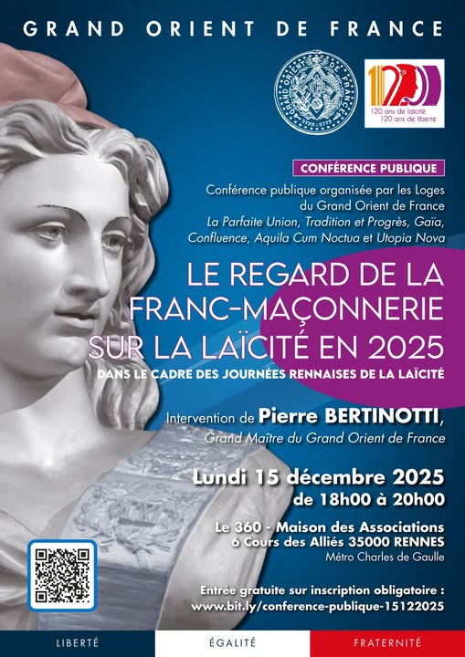 Dans le cadre des Journées rennaises de la Laïcité, plusieurs Loges du Grand Orient de France proposent une conférence publique consacrée aux enjeux contemporains de la laïcité. Un temps d’échange ouvert à toutes et tous, pour éclairer ce principe républicain à l’aune de l’année 2025, de ses débats et de ses défis.