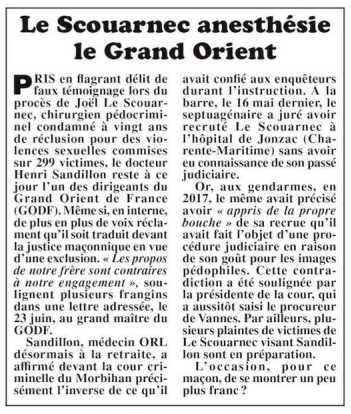 Non mais franchement. Oui Sandillon était conseiller de l’Ordre du GODF . Il ne l’est plus. Mais de là à titrer l’affaire Le Scouarnec et ses liens avec le Grand Orient de France (GODF) ça fait vraiment presse caniveau. On dirait le point ou l’express.