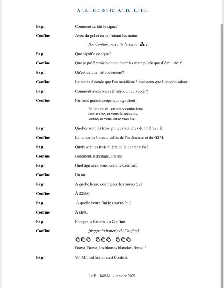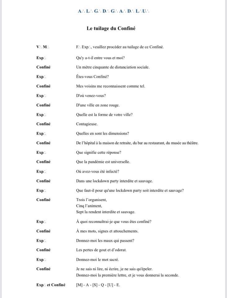 V∴ M∴F∴ Exp∴ , veuillez procéder au tuilage de ce Confiné.