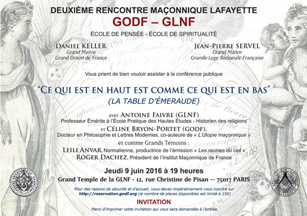 • 09 JUIN 2016 / 2° Rencontres Maçonniques LA FAYETTE – G.L.N.F. – G.O.D.F. sur le thème « CE QUI EST EN HAUT EST COMME CE QUI EST EN BAS – LA TABLE D’EMERAUDE » avec Antoine Faivre, Céline Bryon-Portet, Leili Anvar et Roger Dachez