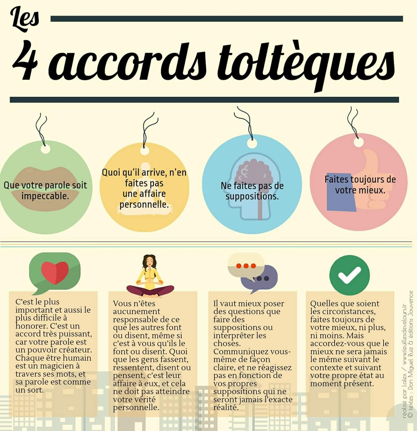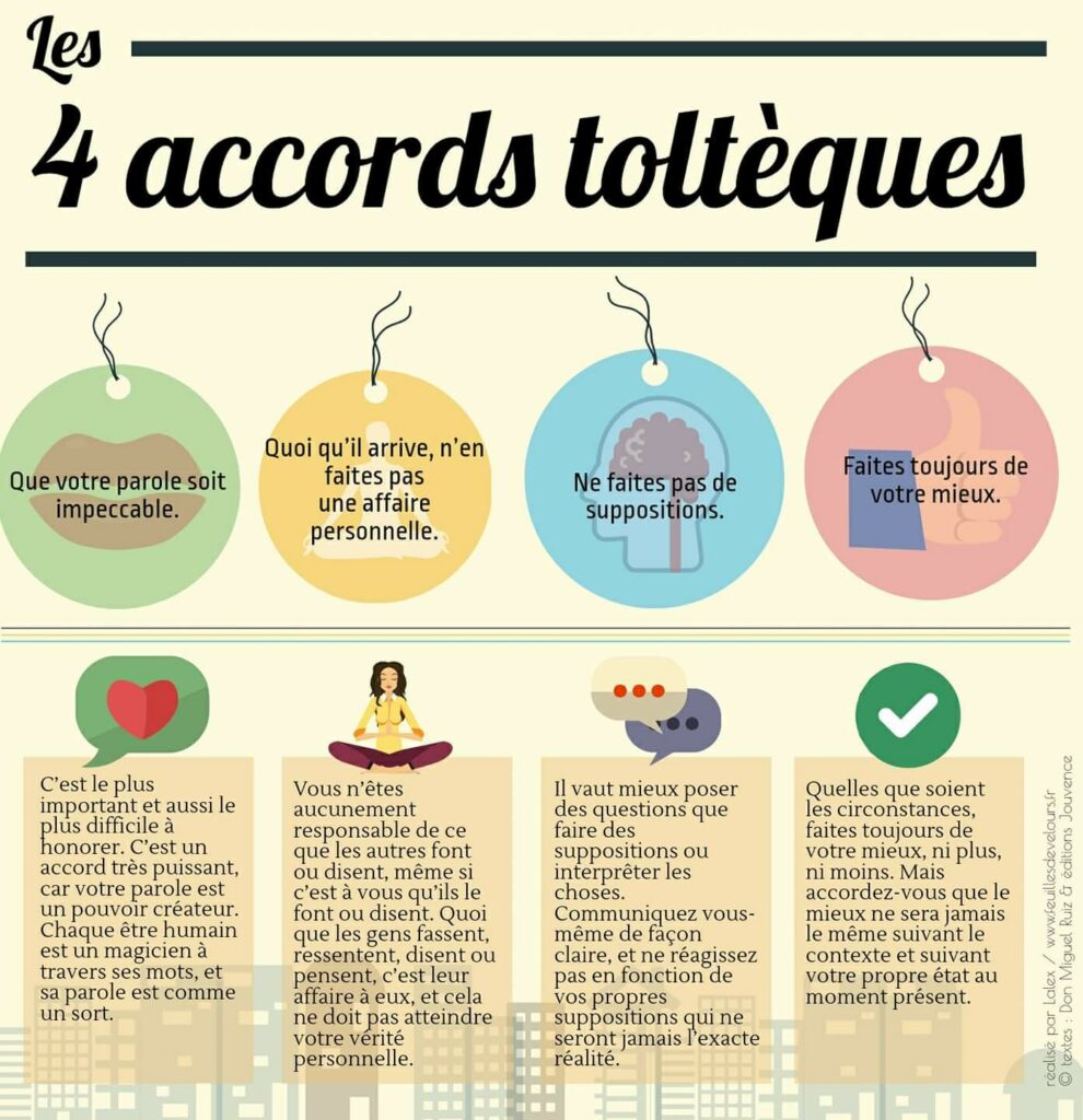 Développés par Don Ruiz, les 4 accords Toltèques sont un principe de vie d’une facilité déconcertante mais tellement difficile à appliquer. Plus on y porte attention, plus notre attention se concentre sur l’instant… Et l’instant s’affine de plus en plus ce qui rend son application toujours plus importante!