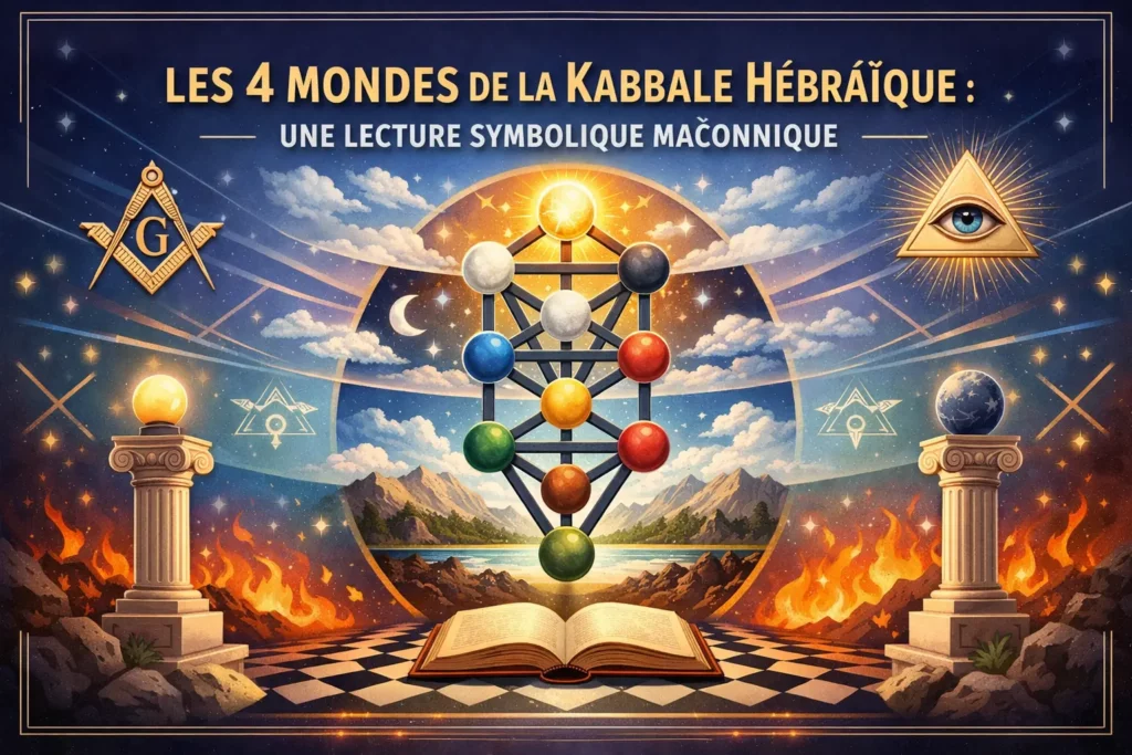Selon la Kabbale hébraïque, l’énergie divine — que les francs-maçons nomment le GADU — descend vers notre monde en traversant quatre plans. Pour se manifester dans la matière, cette lumière passe symboliquement par quatre éléments : la Terre, le Feu, l’Air et l’Eau. Ces quatre niveaux correspondent aussi à quatre « mondes » (ou sphères) habités par des forces angéliques : Émanation, Création, Formation, Action.