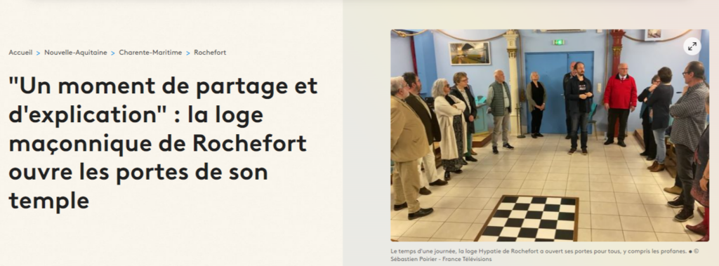 Source : France3-regions.francetvinfo.fr/nouvelle-aquitaine – article « Un moment de partage et d’explication » : la loge maçonnique de Rochefort ouvre les portes de son temple – Écrit par Paul Grelier et Noémie Furling