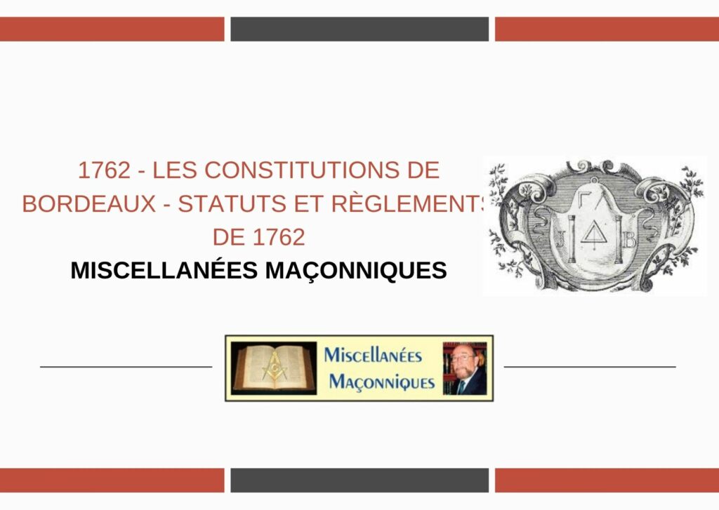 Il en est des  Statuts et Règlements de 1762, souvent appelés Constitutions de Bordeaux, comme d’autres documents maçonniques anciens. Le manuscrit original a dis­paru, on ne sait quand, on ne sait où. Il n’en existe donc plus que des copies qui, par leurs différences, prouvent de façon ab­­so­lue leur caractère frauduleux.