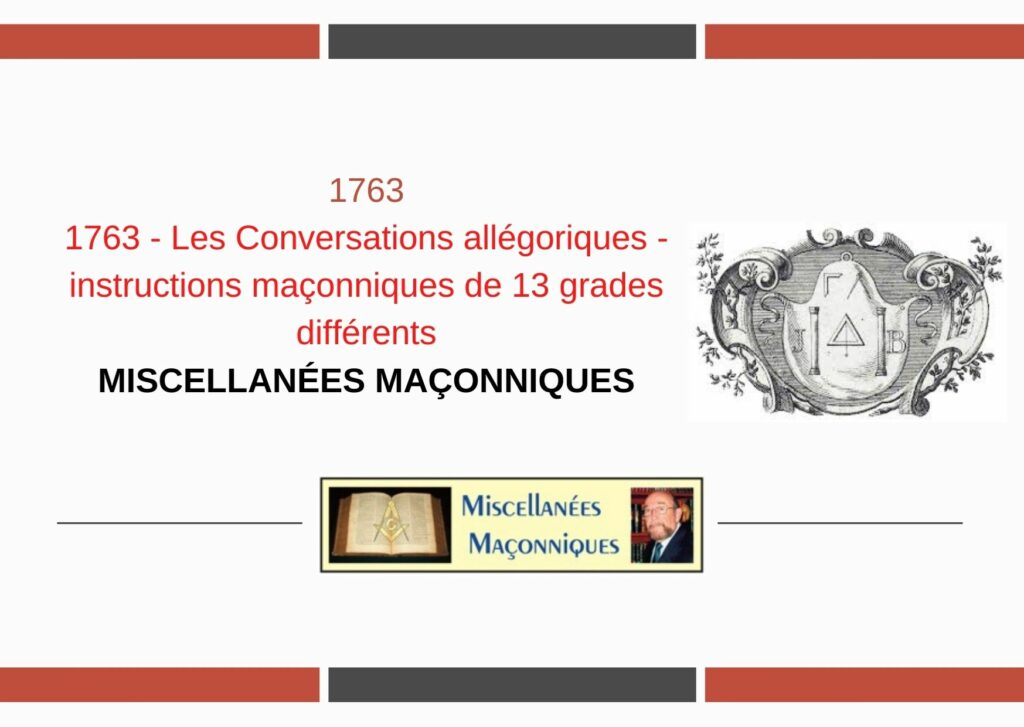 Il s’agit d’une présentation des instructions maçonniques de treize grades différents, dont ceux de Maître Parfait, Maître Irlandais, Maître Anglais, Maître Élu, et Sublime Écossais.