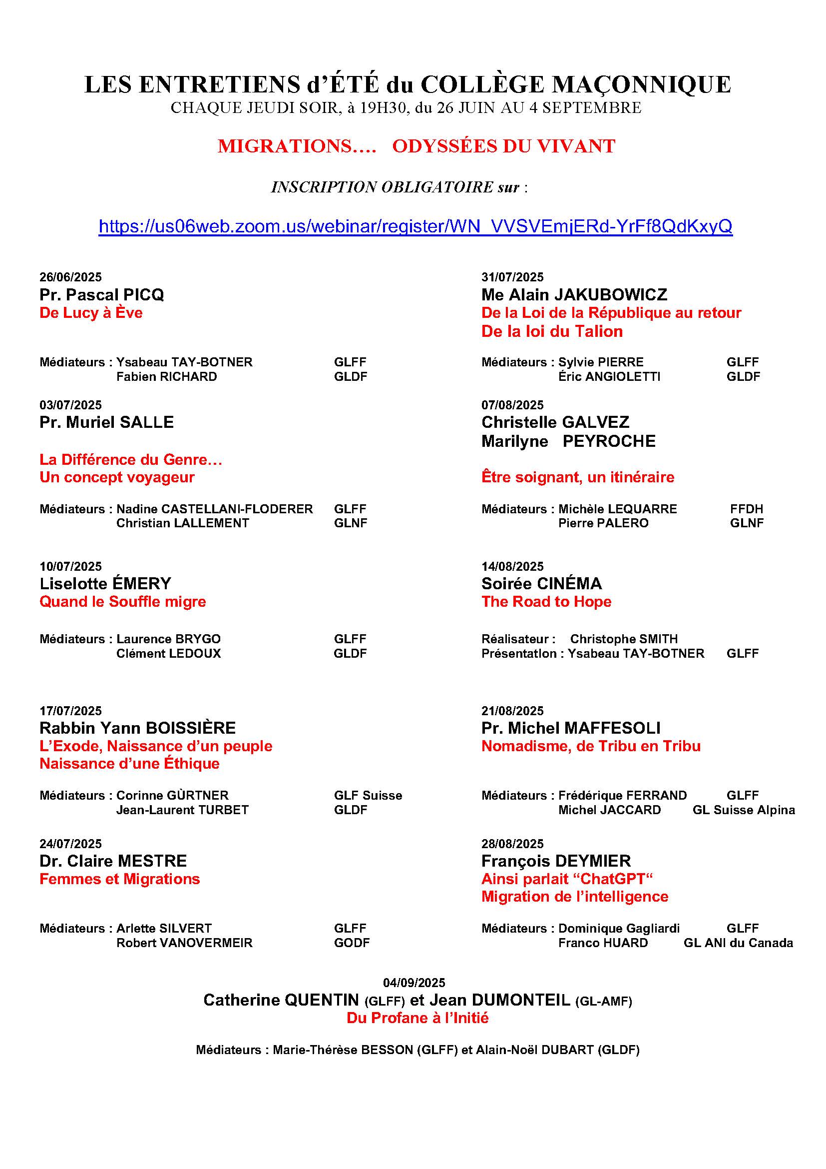 LES ENTRETIENS D’ETE DU COLLEGE MACONNIQUE 2025 – PROGRAMME COMPLET
