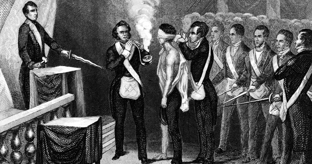- Interrogatoire à l’aveugle lors d’un travail en loge : le postulant, les yeux bandés, est questionné durant une heure sur sa vie, son histoire, sa moralité.