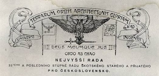 La particularité de la franc-maçonnerie en Tchécoslovaquie résidait dans sa division germano-tchèque. Le 26 octobre 1918, deux jours avant la fondation de l’État, onze francs-maçons tchèques de la loge « Hiram aux Trois Étoiles » et trois autres membres de loges françaises, dont le peintre Alfons Mucha, se réunirent. C’est ainsi que naquit la première loge tchèque de la République tchécoslovaque, nommée « Jan Amos Komenský ». L’expert poursuit :