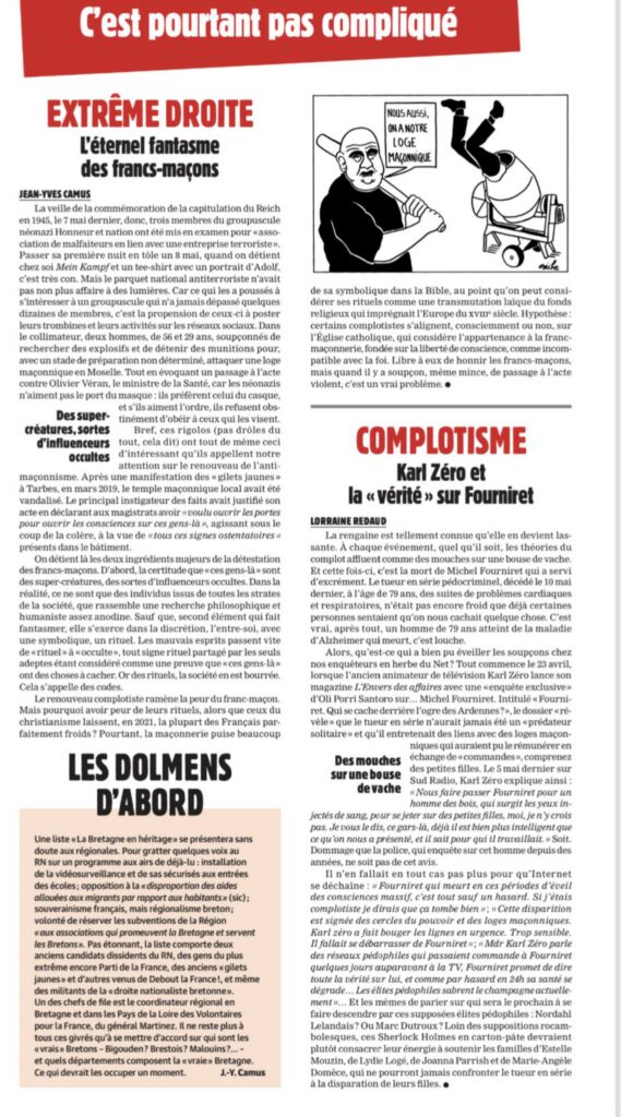 Dans l’édition n°1504 du 19 mai 2021, CHARLIE HEBDO a publié un article sur Extrême droite : l’éternel fantasme des francs-maçons