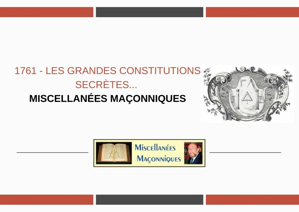 Examinées conjointement avec les Grandes Constitutions de 1786, les Constitutions secrètes de 1761 n’apportent au lecteur aucune information nouvelle. Elles se révèlent, d’emblée, tout autant apocryphes, ne serait-ce que par leur article 9 faisant référence au « Puissant et Illustre Frère Frédéric III, roi de Prusse, Maître Souverain en Chef de l’Armée des Souverains Princes et Chevaliers de l’Aigle Blanc et Noir. »