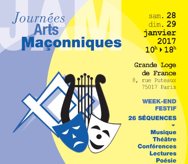 JOURNEES ARTS MACONNIQUESLa 1ère édition se tiendra les 28 & 29 Janvier 2017 Un week-end festif de spectacles, concerts, lectures , conférences, expositions , de théâtre, de poésie, de musiques et de chansons …Du samedi 28 janvier 10h au dimanche 29 janvier 18hJournées Arts MaçonniquesGLDF8 rue Puteaux75017 Paris M° Rome – Ligne 2Un événement organisé par l'Institut Maçonnique de France avec le soutien des 17 obédiences maçonniques en France. Entrée LIBRE et GRATUITE pour tous publics