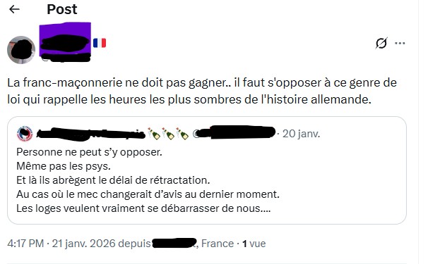 Un message circule, typique de l’antimaçonnisme contemporain : la franc-maçonnerie serait à l’œuvre derrière “une loi sur l’euthanasie ” jugée inquiétante, au point d’être comparée aux « heures les plus sombres de l’histoire allemande ». Le post relaie ensuite une citation affirmant que « personne ne peut s’y opposer, même pas les psys », que l’on « abrège le délai de rétractation » pour éviter qu’« un mec change d’avis », et conclut par la phrase-choc : « Les loges veulent vraiment se débarrasser de nous… ».