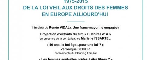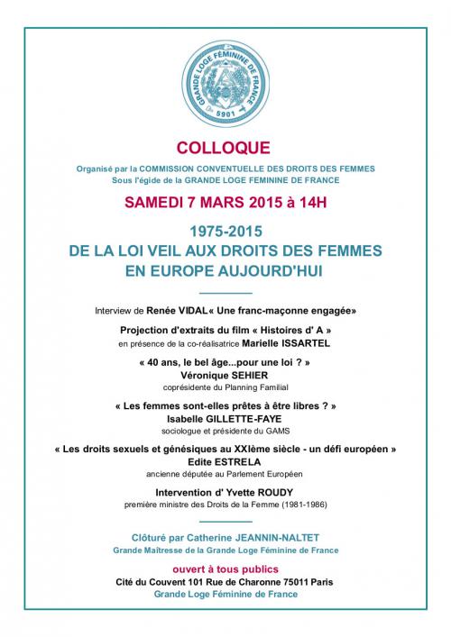 Le 7 mars 2015, la Commission Conventuelle des Droits des Femmes de la Grande Loge Féminine de France (GLFF) vous propose une série de conférences autour de la loi Veil, votée il y a 40 ans.