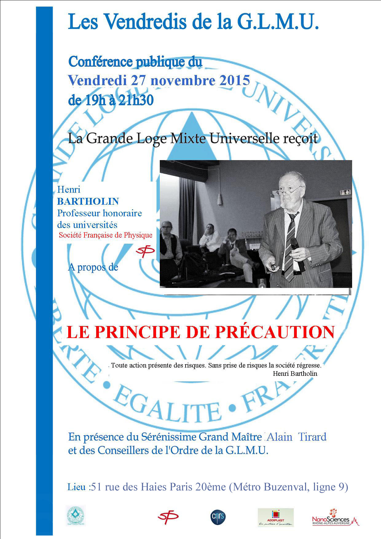 Paris – Le prochain Vendredi de la GLMU qui aura lieu le Vendredi 27 novembre 2015 de 19 h à 21 h 30 au Temple de la Grande Loge Mixte Universelle (GLMU) sur le thème : « Le Principe de Précaution » avec le Conférencier, Monsieur Henri BARTHOLIN, professeur honoraire des Universités (Société Française de Physique).