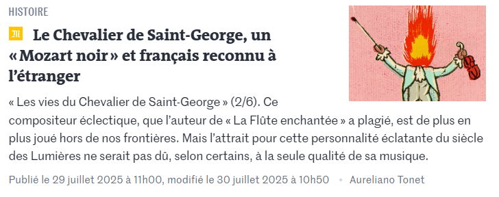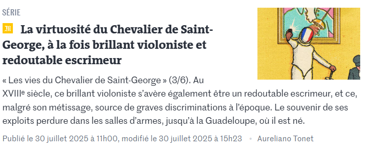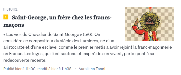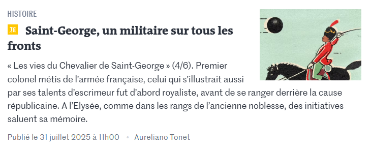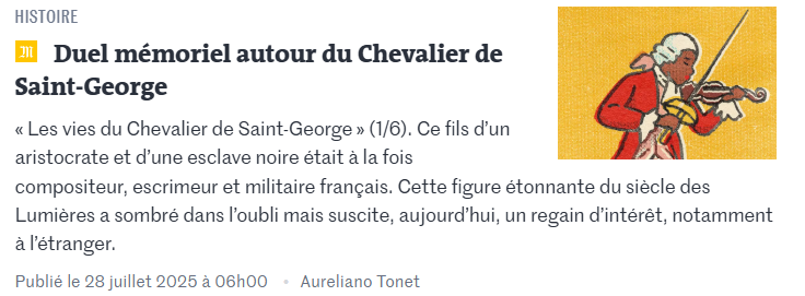 Fils d’un aristocrate blanc et d’une esclave noire, tour à tour escrimeur, compositeur, colonel et franc-maçon cette figure éclectique et éclatante a marqué le siècle des Lumières. Après avoir sombré dans l’oubli, il connaît un spectaculaire retour en grâce.