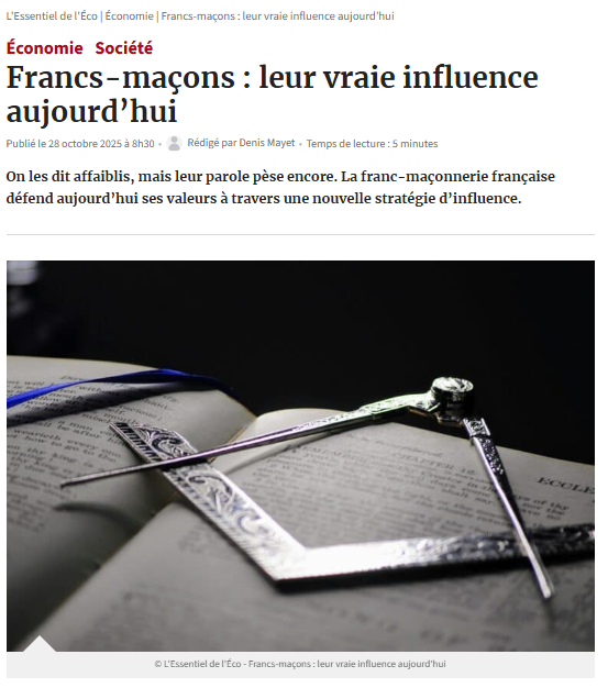 L’article de L’Essentiel de l’Éco – Francs-maçons : leur vraie influence aujourd’hui – rappelle d’abord une évidence trop souvent ignorée : la franc-maçonnerie n’est plus aujourd’hui un pouvoir d’influence occulte, ni un réseau déterminant dans l’appareil politique, comme elle a pu l’être à certaines périodes de l’histoire (notamment sous la IIIᵉ République).