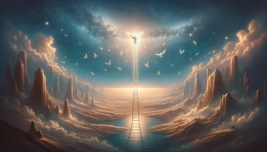 Dans le livre de la Genèse, nous lisons comment Jacob, fils d’Isaac et petit-fils d’Abraham, s’est endormi une nuit en utilisant une pierre comme oreiller. Pendant qu’il dormait, il rêvait d’une échelle s’étendant de la terre au ciel, sur laquelle des anges montaient et descendaient. Au sommet de l’échelle, Dieu est apparu à Jacob et a réaffirmé l’alliance qu’il avait conclue avec ses ancêtres, promettant de le bénir ainsi que ses descendants.