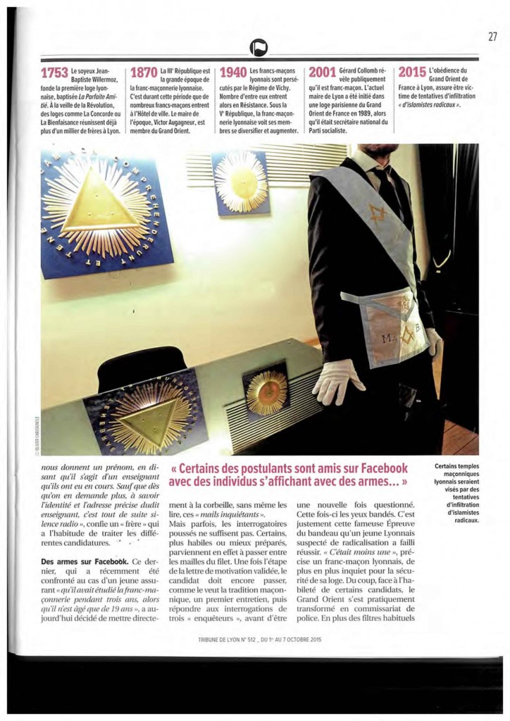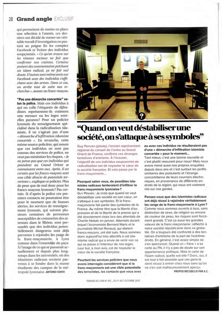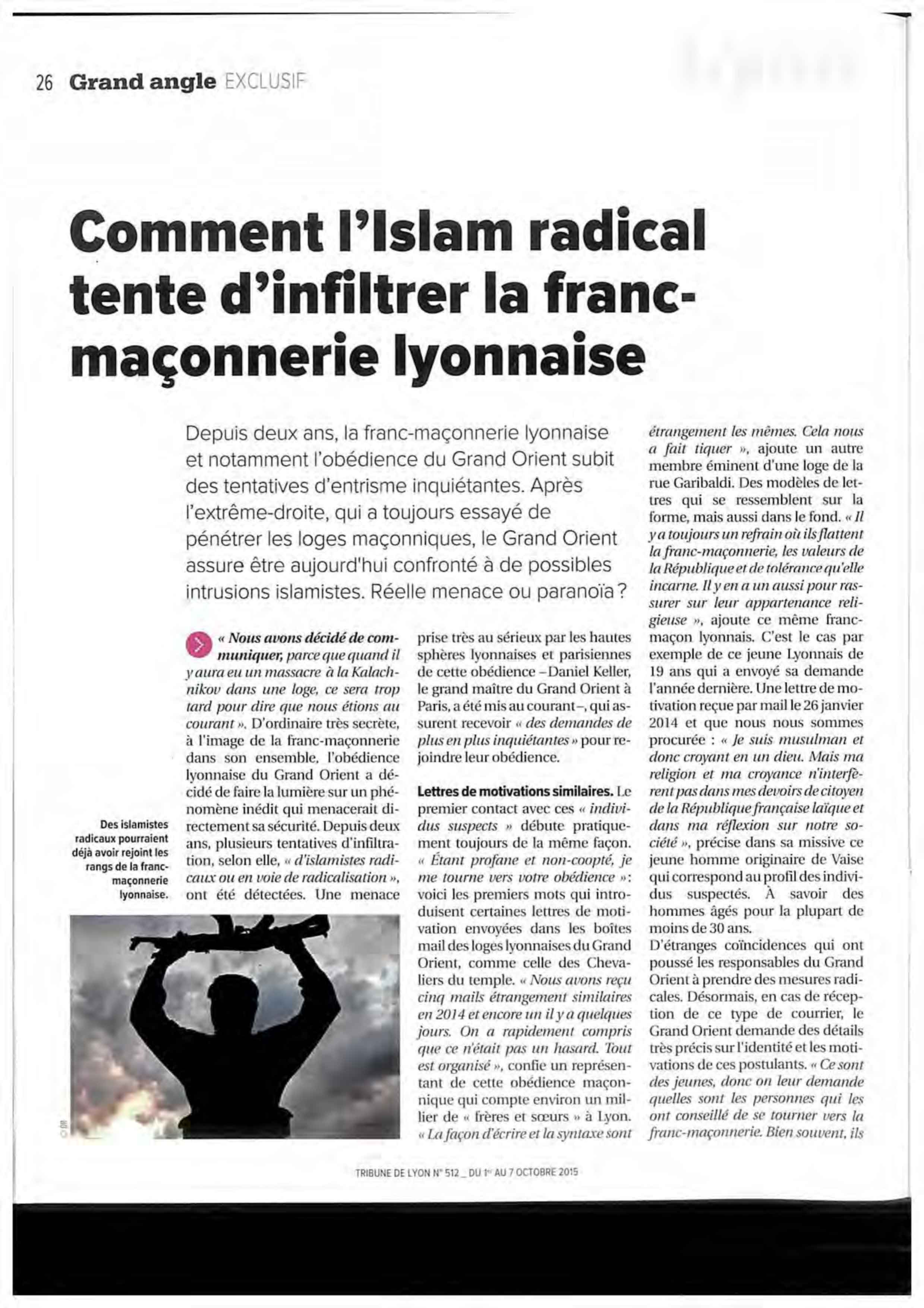 La Tribune de Lyon a publié dans son dernier numéro (n° 5012 du 01 au 07 octobre 2015) un dossier « Comment l’islam radical tente d’infiltrer la franc-maçonnerie lyonnaise »