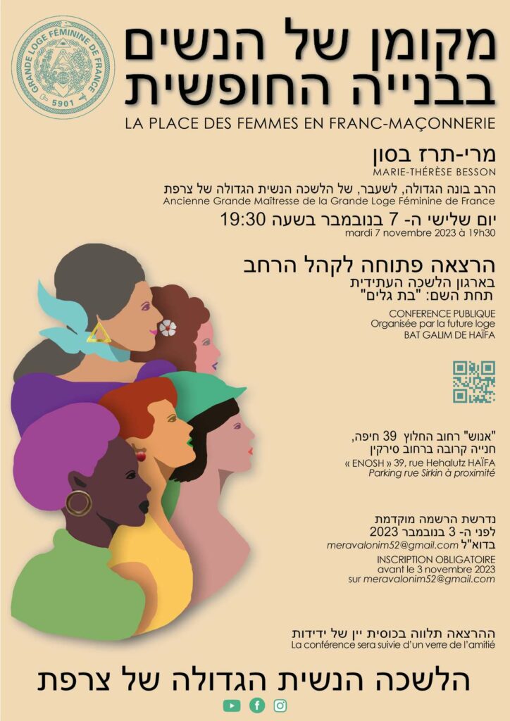 La Grande Loge Féminine de France et la future loge Bat Galim de Haïfa (Israël) vous invitent à une conférence publique sur le thème « La place des femmes en franc-maçonnerie » le 7 novembre 2023 à 19h30 à Haïfa.