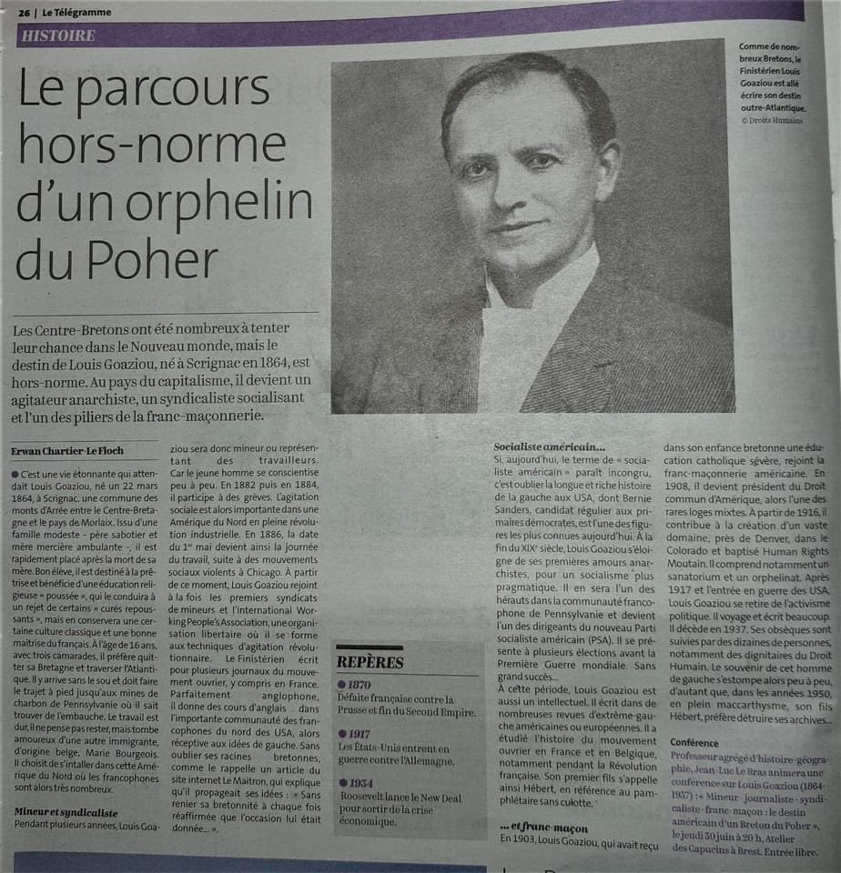 Les Centre-Bretons ont été nombreux à tenter leur chance dans le Nouveau monde, mais le parcours de Louis Goaziou, né à Scrignac en 1864, est hors-norme. Au pays du capitalisme, il devient un agitateur anarchiste, un syndicaliste socialisant et l’un des piliers de la franc-maçonnerie.