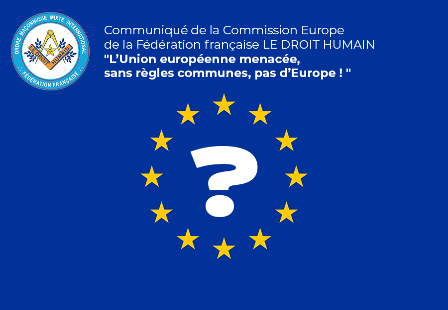 Face aux dangers qui menacent aujourd’hui cette unité, face aux dérives autoritaires de certains États à l’intérieur même de l’Europe, face aux régressions des droits des femmes et des personnes appartenant à des minorités, les Francs-Maçons de la Commission Europe, de la Fédération française de l’Ordre Maçonnique Mixte International Le DROIT HUMAIN, attachés aux valeurs sur lesquelles l’Union européenne a été fondée : respect de la dignité humaine, de liberté, d’égalité, de la laïcité, de l’État de droit, ainsi que du respect des Droits de l’homme, en appellent au respect de ces valeurs inscrites à l’article 2 du Traité sur l’Union européenne.