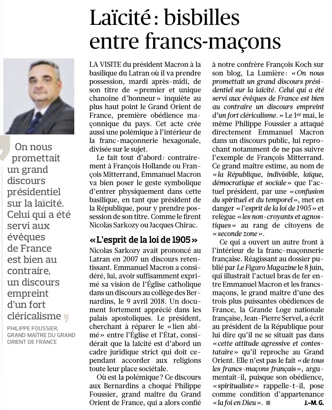 Voici un article publié sur le site Le Figaro le 25 juin 2018 : Laïcité : Macron provoque des bisbilles chez les francs-maçons