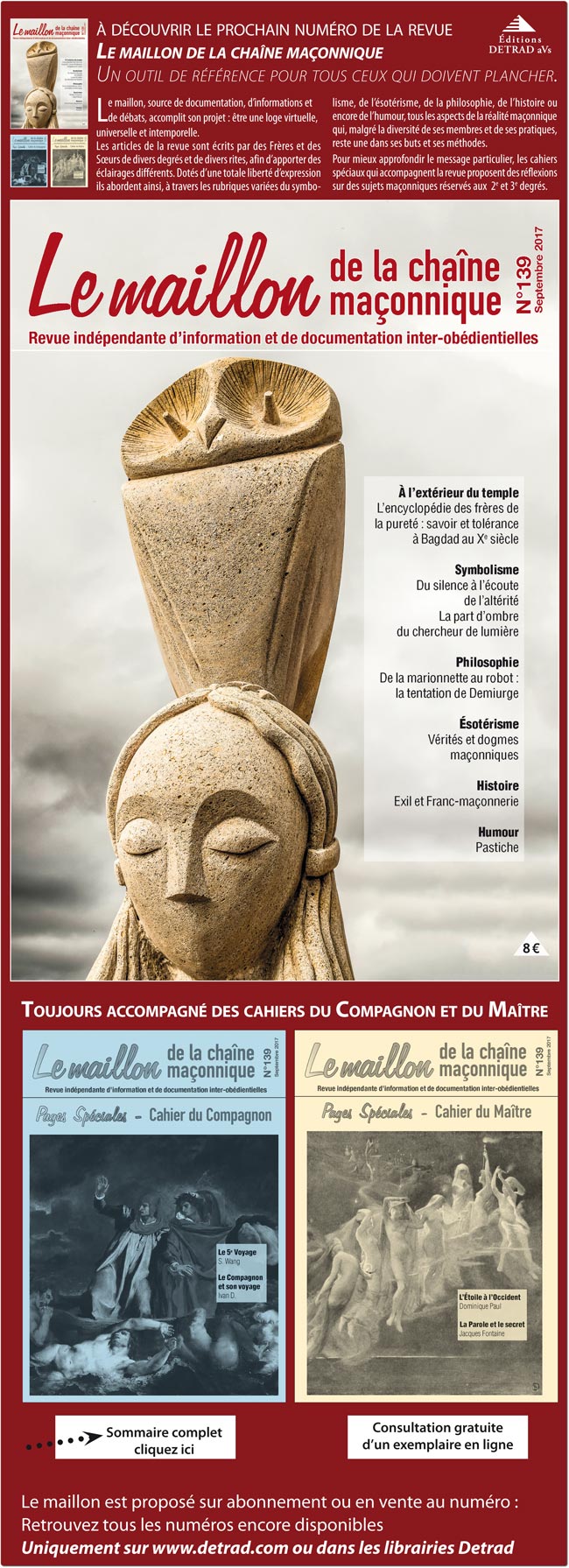 Le Maillon de la Chaîne Maçonnique N° 139 (septembre 2017), revue indépendante d’information et de documentation inter-obédientielles vient de paraître aux éditions Detrad :