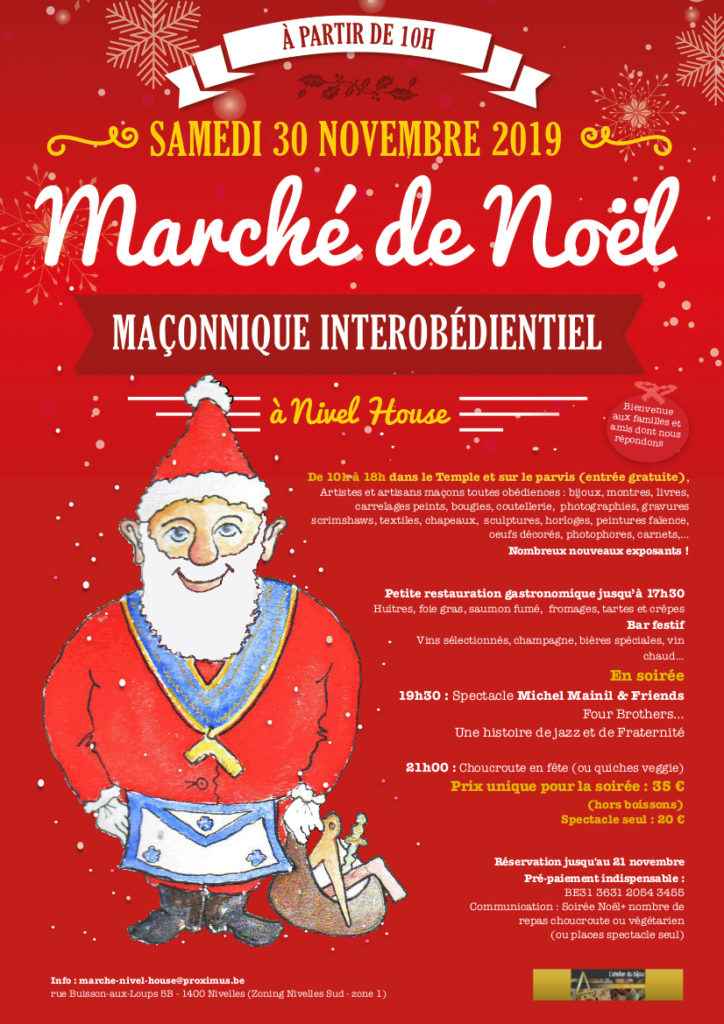 9 Loges (GO / GLB / GLRB / GLFB / Memphis-Misraim / D.H.) réunies dans l’association « Nivel’House » ont pris depuis quelques années l’habitude d’organiser en commun différentes activités, dont la plus importante est sans conteste ce qui est devenu le traditionnel marché de Noël maçonnique inter-obédientiel de Nivelles