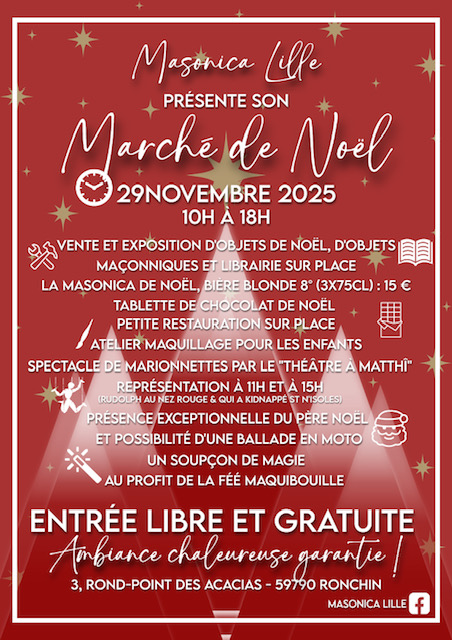 Masonica Lille donne rendez-vous au public le samedi 29 novembre 2025, de 10h à 18h, pour son traditionnel Marché de Noël, au 3 Rond-Point des Acacias à Ronchin.