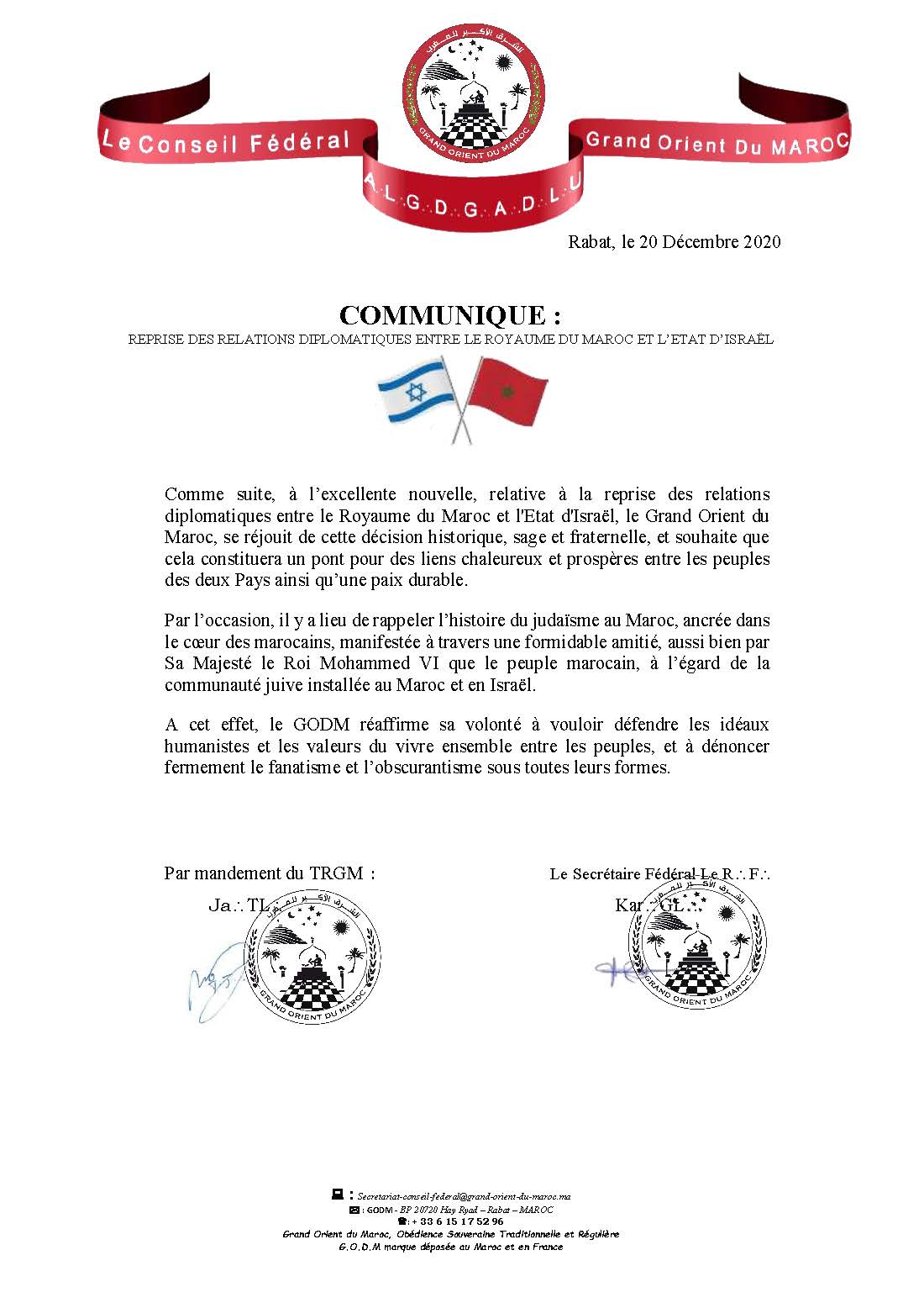 Le Grand Orient Du Maroc (GODM) nous a fait parvenir à cet effet un communiqué rappelant notamment les liens unissant les 2 communuatés: