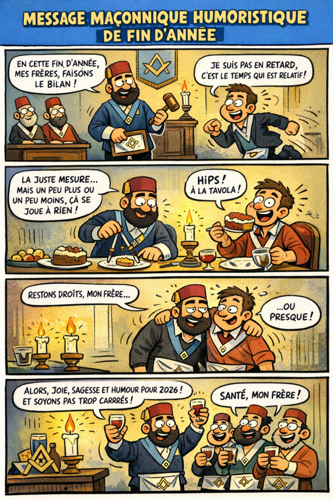 Le compas, de son côté, nous a parlé de mesure : mesure dans les paroles, mesure dans les jugements… et mesure dans les agapes. Pour les deux premières, on progresse. Pour la troisième, disons que la “juste proportion” dépend d’un facteur initiatique encore mal compris : le nombre de plats, multiplié par la bonne volonté du Frère qui ressert. Et là, le compas a beau s’ouvrir, il finit toujours par manquer d’amplitude.
