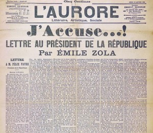 • 13 janvier 1898. – Intervenant dans le débat public suscité par l’Affaire Dreyfus, Émile Zola publie son célèbre « J’accuse…! » en première page du journal L’Aurore ; il s’agit d’une lettre ouverte au président de la République – en l’occurrence Félix Faure –, en vue d’entraîner la révision du procès condamnant le capitaine Dreyfus. Zola fera l’objet d’un procès en diffamation et sera lui-même condamné à… un an de prison. Deux mois plus tôt, en octobre 1897, Camille Pelletan, apprenti franc-maçon et député radical, a affirmé de son côté, dans les colonnes de La Dépêche de Toulouse, à propos du capitaine Dreyfuso: « L’accusé est trop soutenu pour être de ceux qu’on condamne sans motif. »