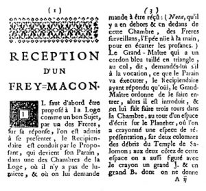 IL faut d’abord être proposé à la Loge comme un bon Sujet, par un des Frères ; sur sa réponse, l’on est admis à se présenter ; le récipiendaire est conduit par le Proposant, qui devient son Parrain, dans une des Chambres de la Loge, où il n’y a pas de lumière, et où on lui demande s’il a la vocation d’être reçu ; il répond que Oui, ensuite, on lui demande ses nom, surnom, et qualité ; on le dépouille de tous les Métaux et Joyaux qu’il peut avoir sur lui, comme boucles, boutons, bagues, boîtes, etc.