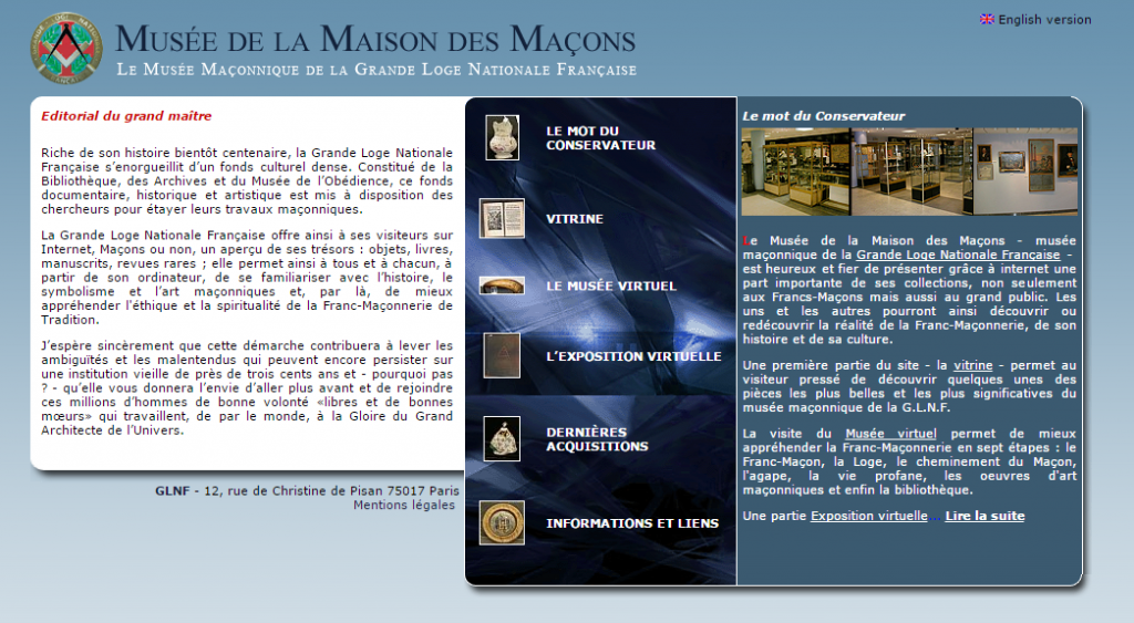 Une première partie du site – la vitrine – permet au visiteur pressé de découvrir quelques unes des pièces les plus belles et les plus significatives du musée maçonnique de la G.L.N.F. La visite du Musée virtuel permet de mieux appréhender la Franc-Maçonnerie en sept étapes : le Franc-Maçon, la Loge, le cheminement du Maçon, l’agape, la vie profane, les oeuvres d’art maçonniques et enfin la bibliothèque.