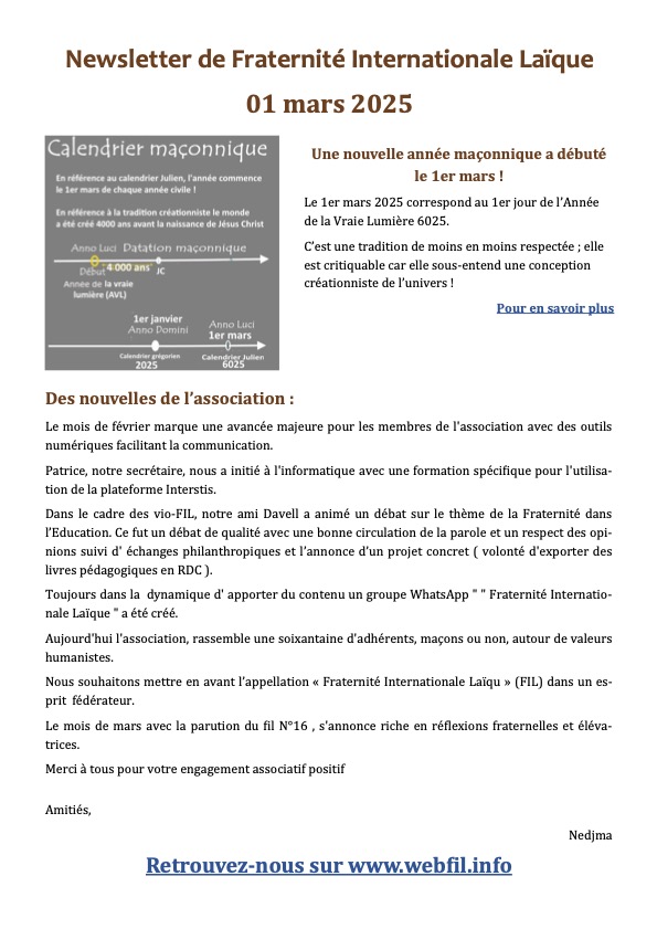 NEWSLETTER DE LA FRATERNITÉ INTERNATIONALE LAÏQUE Actualités | 5 mars 2025 | 0 | by A.S. Newsletter de Fraternité Internationale Laïque 01 mars 2025https://www.webfil.info