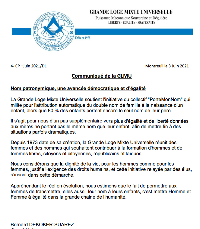 Communiqué de Presse de la Grande Loge Mixte Universelle– GLMU concernant « Nom patronymique, une avancée démocratique et d’égalité »