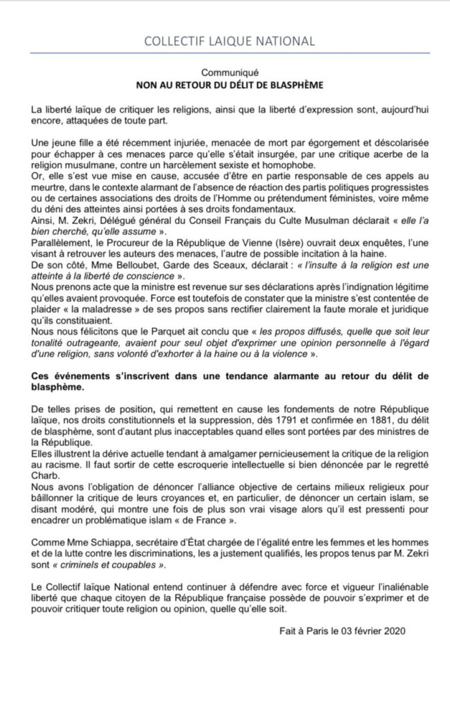 Communiqué du Collectif Laïque National intitulé « Non au retour du délit de blasphème » signé notamment par cinq obédiences maçonniques ( le GODF, la GLMF, la GLMU, la GLFF et la GLFMM).