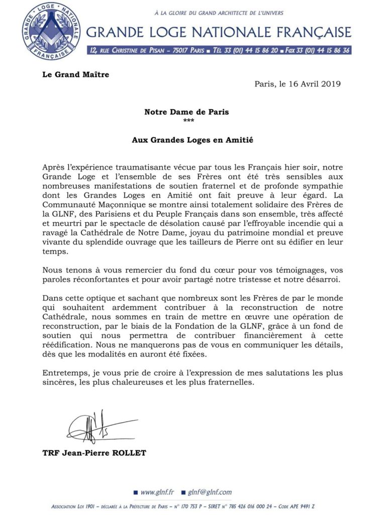 Mardi 16 avril 2019, le Grand Maître de la Grande Loge Nationale Française, le TRF Jean-Pierre Rollet, s’adresse aux Grandes Loges en Amitié