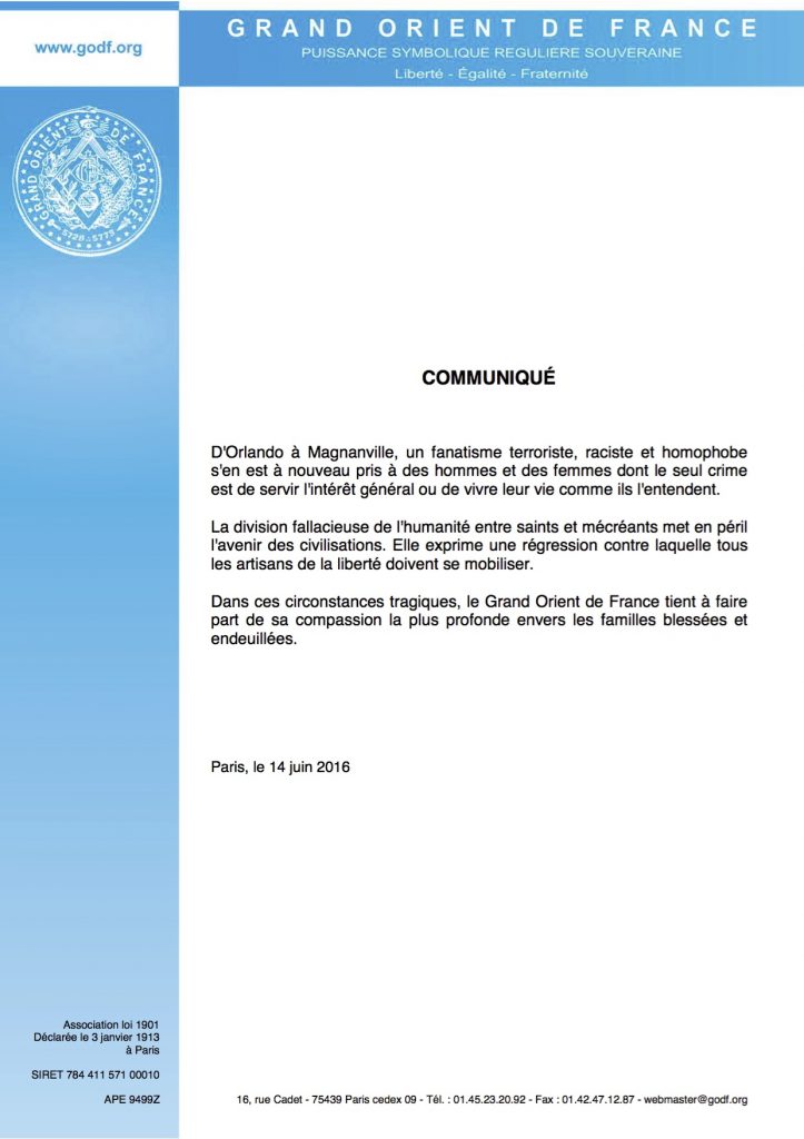 Communiqué du Grand Orient de France (GODF) sur les attentats d’Orlando et Magnanville :