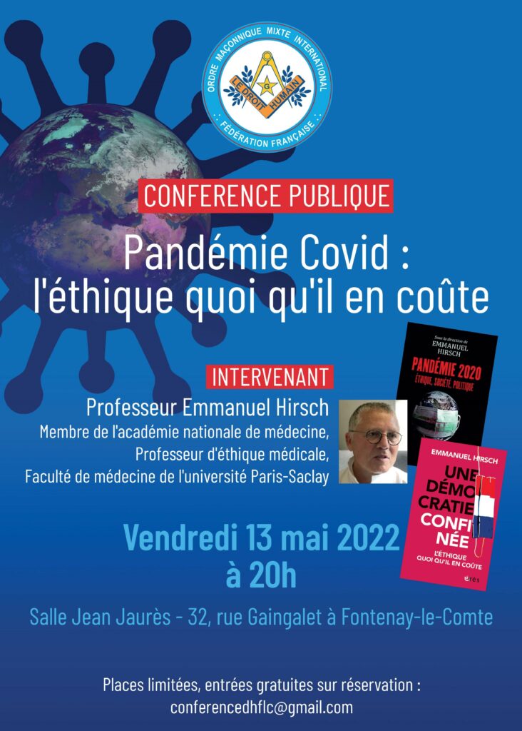 C’est à l’invitation de la loge locale « Emancipation vendéenne » de la Fédération française de l’Ordre Maçonnique Mixte International LE DROIT HUMAIN que le professeur Emmanuel HIRSCH apportera lors de cette conférence publique ses éclairages sur l’éthique en période de pandémie de Covid ce vendredi 13 mai 2022 à 20h à la salle Jean-Jaurès du 32 rue Gaingalet à Fontenay-le-Comte.