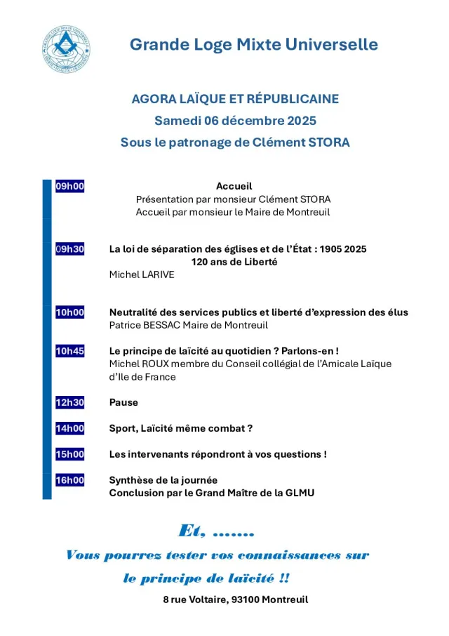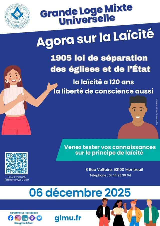 Vous souhaitez participer à l’événement « Agora sur la laïcité » organisé par la Grande Loge Mixte Universelle (GLMU) , nous vous invitons à vous y inscrire à l’aide du formulaire ci-après.