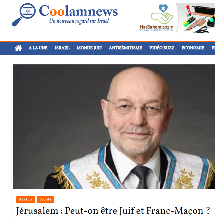 Le site Coolamnews, media francophone en Israël assurant une veille de l’actualité Israélienne a publié le 06 mai 2019 un article intitulé « Jérusalem : Peut-on être Juif et Franc-Maçon ? » à l’occasion de la visite en Israël du Grand Maître de la Grande Loge de France (GLDF), Pierre-Marie ADAM à l’occasion de sa visite en Israël pour une conférence le 12 mai 2019, à Tel Aviv-Yafo sur le thème « Franc-Maçonnerie à la Grande loge de France aujourd’hui ».