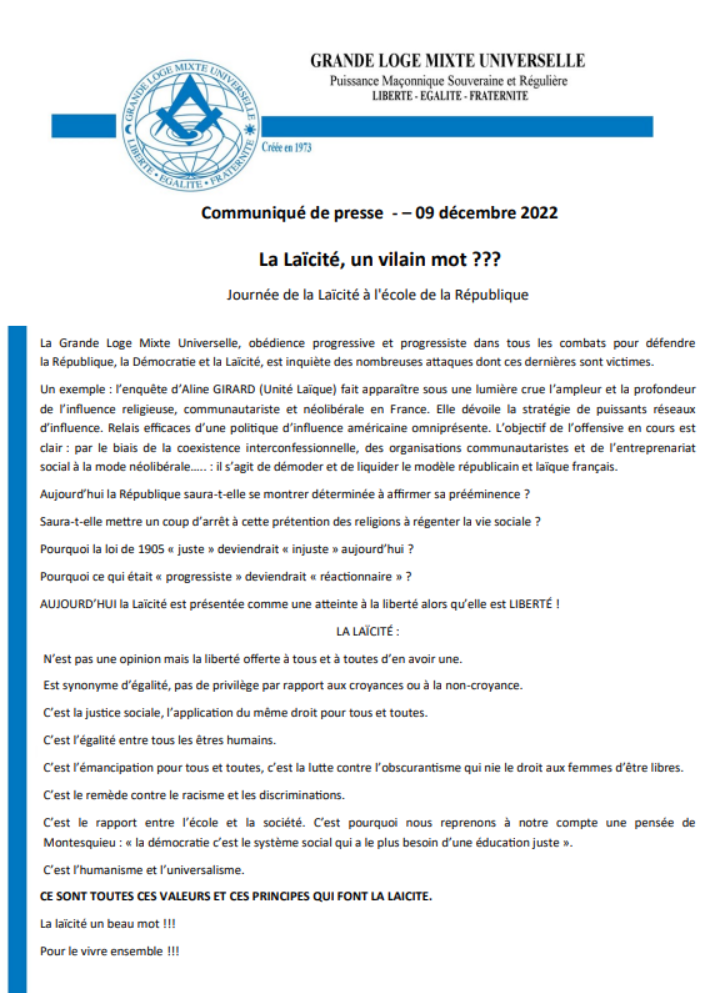 Communiqué de presse de la Grande Loge Mixte Universelle (GLMU) à l’occasion de la journée de la laïcité à l’école de la République, ce vendredi 09 décembre 2022.