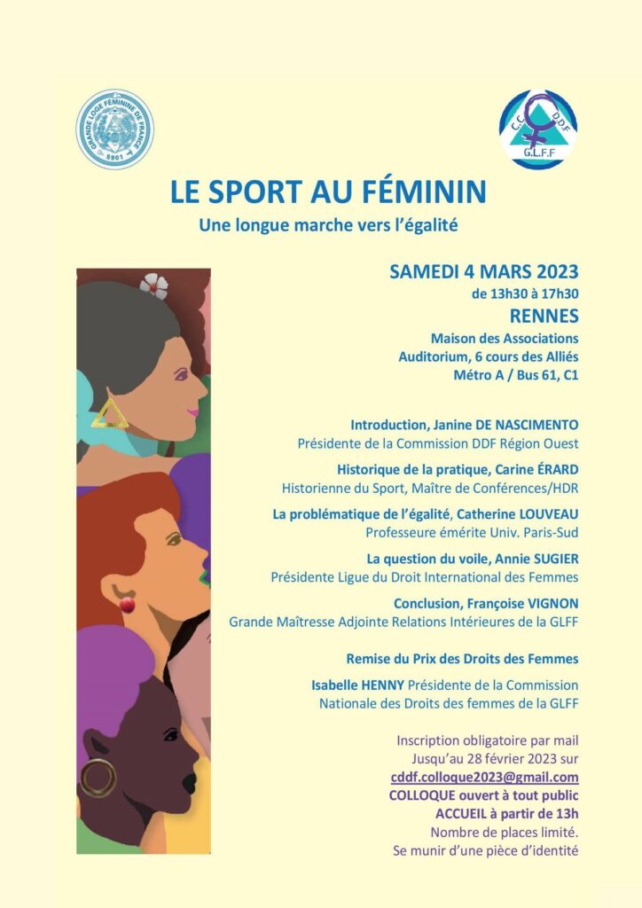 La Grande Loge Féminine de France et la Commission Nationale des Droits des Femmes vous invitent à un colloque public sur le thème « Le sport au féminin, une longue marcher vers l’égalité » le samedi 4 mars 2023 de 13h30 à 17h30 à Rennes