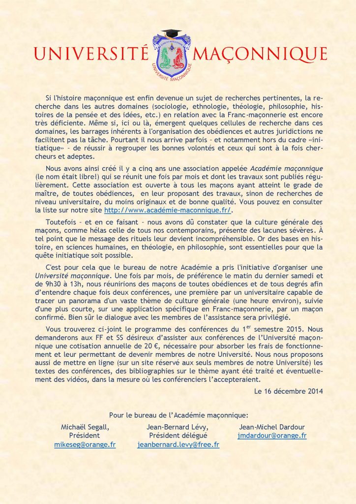 L’Université Maçonnique nous dévoile son programme 2016/2016 :