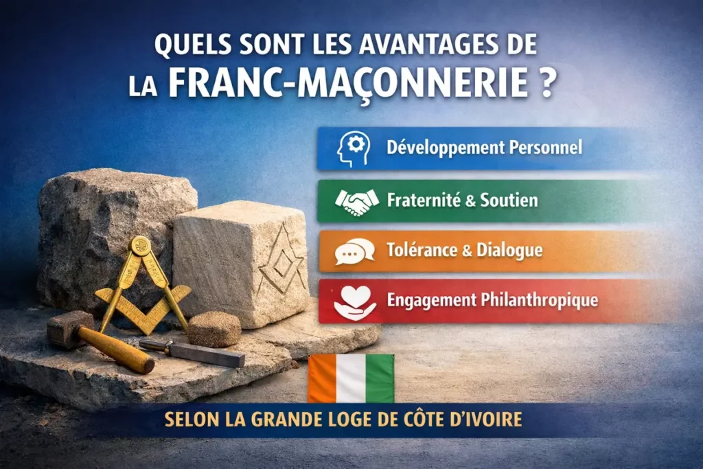 Présentée par la Grande Loge de Côte d’Ivoire, la franc-maçonnerie met en avant des bénéfices centrés sur la transformation personnelle, la fraternité, la tolérance et l’engagement. On est loin d’une logique utilitariste : il s’agit davantage d’une école de méthode, de dialogue et de conscience, avec pour horizon une amélioration de soi au service d’un idéal humaniste.