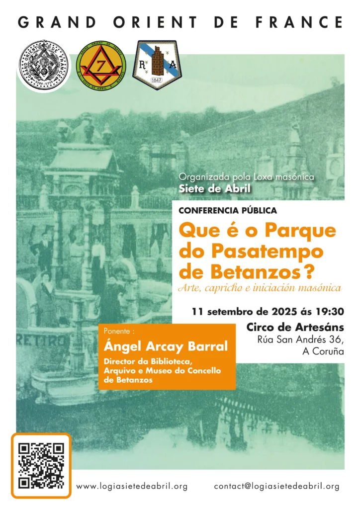QU’EST CE QUE LE PARC BETANZOS PASTEMPO ? ART, FANTAISIE ET INITIATION MACONNIQUE Evenements | 23 août 2025 | 0 | by A.S. Qu’est-ce que le parc Betanzos Pasatempo ? Art, fantaisie et initiation maçonnique : Conférence publique organisée par la Loge maçonnique Siete de Abril.